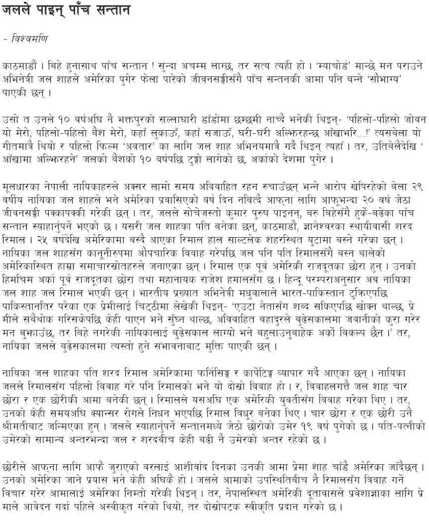Some strange news I came across today. It says - Nepali actress Jal Saha gets married with a person in US who is almost 20 years older than her and he has already 4 kids.. His first wife died of cancer. Details news on Jana aastha weekly at - http://www.nepalnews.com/contents/2007/nepaliweekly/janastha/feb/feb21/mainnews.php#1 Though it's her personal matter.. Posted here just cuz she is a public figure, so thought it is OK. ~BM
