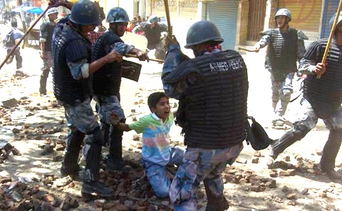 There is a saying that your eyes will see what you what to see. I think that applies to you Jai Nepal bro. So you think that those police are not beating that little boy ...well than can you explain why is he crying like that ?..and why is that one police is lifting his Stick(lathi), is he trying to straighten him and rest are trying to stop by their boots? And what about your previous post about giving lesson to those kids and those khates in nepal. I have nothign but Pitty for some moran like you who don't even spare little kid like this one in the name of poltics. It is not Girija or prachanda or some fu(ked up politician that is problem in Nepal, it is some educated (I assume you are little) that is a big problem of Nepal.