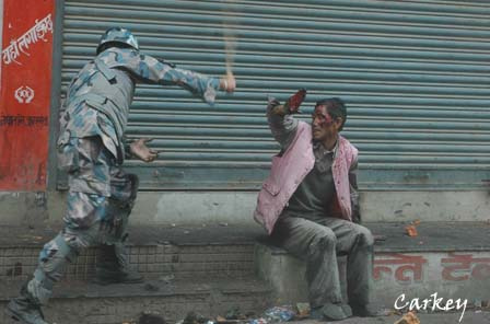 Here! this is what it is ... That kid is our country Nepal and 4 Policemen surrounding him are Girija, Madav, Prachanda, and Sher Bahadur ... Our country getting beaten up by our own leaders .. Like the kid is looking upto the Policeman we look upto our leaders .. but everytime we get hit by a stick .. we are all helpless like that kid .. that's the reality