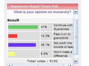 I was just going through the poll in Nepal news. And was amazed that over 50% still supports monarchy. And these people who voted are so called intellectual people. I am definitely sure there will be more people supporting king from poor background. So i really dont know why the netas are telling "People's mandate is to remove king".
