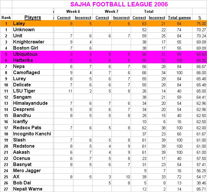 Congratulation to Bathroomcoffee too, he wins the title for the worst record with the 3 wins for week 7. Thanks for taking the title away from me :=)