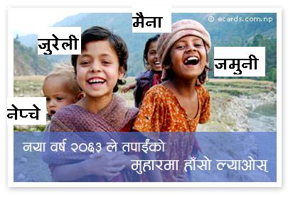 नयाँ बर्ष २०६३ को शुभकामना !!! सबै मित्रहरुलाई। जाँदा जाँदै: पुन्टेदाइ सँगको मेरो झगडालाई आजैका मितिबाट २०६२ ले सँगै लगोस। :-) नेप्चे चैँ जुरेलीको मामाको छोरो भो के रे। सानोमा कम्ति मयाँ अर्दिनथी ल त्यसले नेप्चेलाई। :-)
