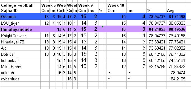Week 10 resuts... Ocenus is still on the top!!..and This week's Winner is Himalayandude..He's got a huge comeback since last couple of weeks... Bob dai..you goin down man..what's the matter??? Happy for Tigers win today!!>..Go tigers!!