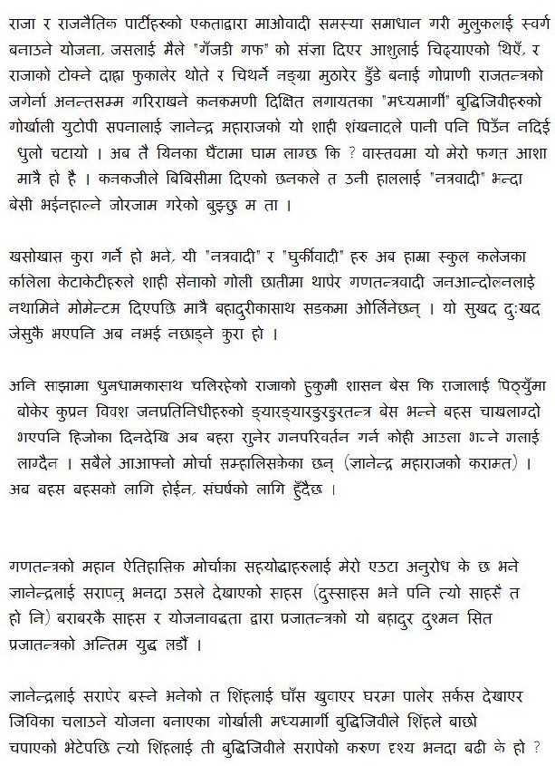 अनि साझामा धुमधामकासाथ चलिरहेको राजाको हुकुमी शासन बेस कि राजालाई पिठ्युँमा बोकेर कुप्रन विवश जनप्रतिनिधीहरुको ङ्यारङ्यारङुरङुरतन्त्र बेस भन्ने बहस चाखलाग्दो भएपनि हिजोका दिनदेखि अब बहस सुनेर मनपरिवर्तन गर्न कोही आउला भन्ने मलाई लाग्दैन । सबैले आआफ्नो मोर्चा सम्हालिसकेका छन् (ज्ञानेन्द्र महाराजको करामत) । अब बहस बहसको लागि होईन, संघर्षको लागि हुँदैछ । गणतन्त्रको महान ऐतिहासिक मोर्चाका सहयोद्धाहरुलाई मेरो एउटा अनुरोध के छ भने ज्ञानेन्द्रलाई सरापनु भनदा उसले देखाएको साहस (दुस्साहस भने पनि त्यो साहसै त हो नि) बराबरकै साहस र योजनावद्धता द्वारा प्रजातन्त्रको यो बहादुर दुश्मन सित प्रजातन्त्रको अन्तिम युद्ध लडौं । ज्ञानेन्द्रलाई सरापेर बस्ने भनेको त शिंहलाई घाँस खुवाएर घरमा पालेर सर्कस देखाएर जिविका चलाउने योजना बनाएका गोर्खाली मध्यमार्गी बुद्धिजिवीले शिंहले बाछो चपाएको भेटेपछि त्यो शिंहलाई ती बुद्धिजिवीले सरापेको करुण दृश्य भनदा बढी के हो ?