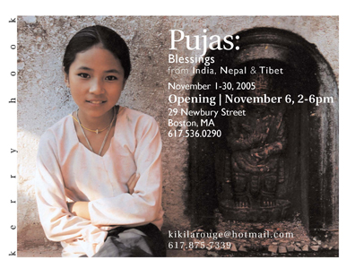 If anyone is interested in photography, 29 Newbury will be featuring artist Kerry "Kiki" Hook's latest works from South Asia. The show dates are November 1-30, 2005 with an opening reception on November 6th from 2-6PM at 29 Newbury Street in Boston. Additionally, Tibetan prayer flags will sold and 100% of the profits will be donated to "Maiti Nepal" and Ani Choying's "Arya Tara School" in KTM.
