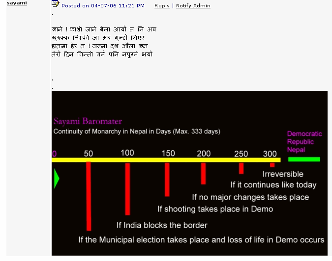 . I started this thread Jan 19 2006 Countdown Autocracy in 333 days. It is exactly an year ago almost there. It needed 34 more days. Anyway Monarchy has come to an end. आज गोराखनाथको १२ पुस्ते आशिर्बाद पुरा ।