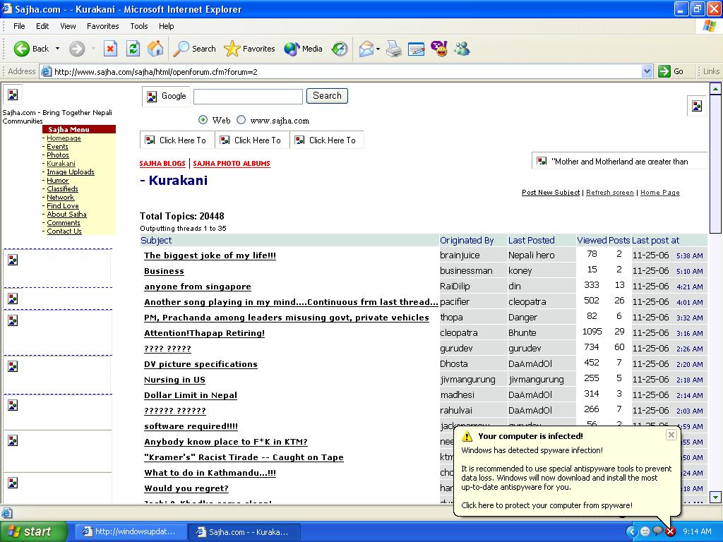 There's a problem in my computer. It shows the following message and internet if very slow and I can' t even update windows....coz the website never opens. Lucky that sajha got in this optical wires and now on my screen but still problems in browsing sajha...I've tried to post the jpg file to clear... PLEASE HELP ME OUT. WHAT COULD BE THE SOLUTION? PLZ SAJHA COMPUTER EXPERTS HELP ME OUT!!!