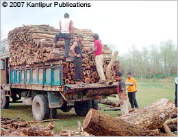 माओवादीले चितवनको कुमरोज गाविसस्थित पुमोरी जंगलमा काटेका रूख बिक्रीका लागि लैजान ट्रकमा लोड गर्दै । उनीहरूले त्यस क्षेत्रमा करिब ८४ बिघा जंगल कब्जा र फँडानी गरिरहेका छन् । गत बिहीबार मात्रै उनीहरूले १५ लाख रुपैयाँ बराबरको काठ बिक्री गरे । जंगल फँडानीले आसपासका सौराह, कुमरोज, धरमपुर, गौबई, बैरिया, बछ्यौली, नजकौली गाउँ नदीको कटानबाट प्रभावित हुने भएकाले स्थानीय बासिन्दाले फँडानी रोक्न प्रशासनसमक्ष आग्रह गरेका छन् । प्रशासनले फँडानी रोक्न पहल नगरेको स्थानीयवासीको गुनासो छ भने माओवादीका इलाका इन्चार्ज कृष्ण अर्यालले ँमाथिको आदेश’ अनुसार काम गरिएको भन्दै पार्टीले रोक्न निर्देशन नदिएसम्म जारी रहने बताए