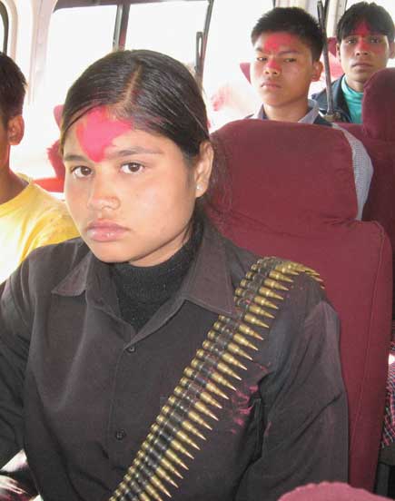pathetic!! she would look better of with books and bags..look at her staring as if shes gonna shoot all those bullets in your head...gosh these maoist have filled so much anger in these people that they have to carry arms.. and ammuntion..