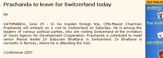 Prachanda said that the visit will be helpful in developing international relations of the Maoists.Talking to reporters at the Tribhuwan International Airport (TIA), Prachanda revealed that his party had good relations with Swiss government officials even during the peak of their conflict. source .Nepalnews.com