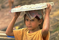 The picture is of a girl working in the reconstruction effort carries a tile on her head in the city of Choluteca, Honduras