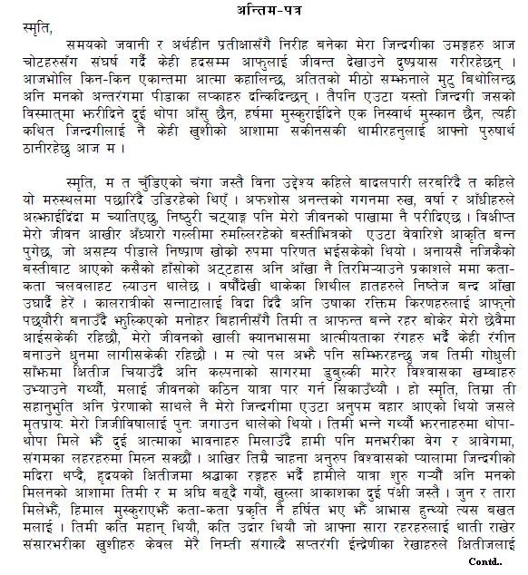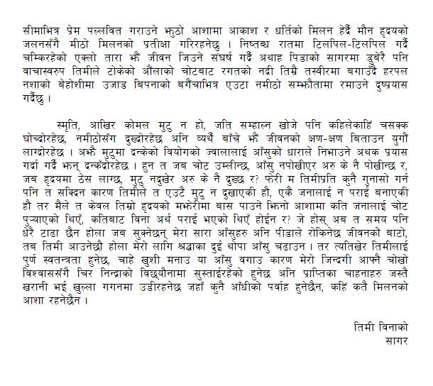 मैले पिरतिको माला नगुथेको त होइन तर मैले आफ्नो मायाको पारितोषिक पाउन भने कहिले सकिन!बारम्बार म सधै एउटै कुरा वोकली रहेको हुन्थे कि म तिमीलाई माया गर्छु भनेर! तर मेरो मायालाई डाढ भाँचिनि गरी हिर्काएर, मर्याक्मुर्क़ बटारेर उस्ले त कान्लाई कटाईदी! म जति जति नजिक हुन्थे उ त्यति त्यति पर हुन्थि मानुकि म एउटा सर्प जो उसलाई टोक्न अघि बढी रखेको थियो! मैले आफ्नु सारा जीवन उस्को लागि नाम सारि पनि त नगरदिएको होइन! तर यो मुटुमा राखेर उसलाई आखाँमा सजाउने सपनामा ठुलो लाठि चाजॅ भयो ! अन्तमा मेरा साथि एकान्त र पीडा भए! दुखको सागरमा तहिरिन खोज्दा म निकै पर उछिटीऍ! मेरो आकाँक्षा र अभिलाषा माथि ठुलो तुसारापात भयो! म यो भूमन्ड्ल्मा एक्लै परेँ ! निराशाको कालो बादलले मलाई ढाकी रह्यो मानुकि एउटा जनावर् ले आफ्नु बच्चा च्यापेको जस्तो! तिम्रो न्यानो अँगालो भित्र बाँधिएर तिम्रो आँखाबाट सँसार हेर्ने सपना अधुरै रह्यो! यो मुटुमा बन्चरोले लाग्यो अनि म भुँईमा बजारिन पुगेँ! पिरतीको चोट बन्चरोको भन्दा गहिरो र पीडादायी हुन्छ! एउटा कुस्तीबाजले हिर्काएको भन्दा बढी ढुख्छ, अनि हरेक साँझ मेरो शरीरबाट छिरी मेरो मुटु छियाछिया बनाई निस्कन्छ! म लामो सास फेर्दै अलिकति जीउमा हलुका अनुभव गर्छु! तर मेरो नशा नशामा पुराना यादहरुले किल्ला गाडेर यसरी बसेका छन कि जसलाई हावा चल्दा पनि ढुख्छ ! यो मुटुको हरेक स्पन्दन आज उन्कै नाममा समर्पण गर्न चाहन्छु! मेरो सानो रचना उस्का यादहरुले ओत्प्रोत भएका छन्! मुटु माझ हिउँ पर्यो केले मात्र म सेकिरहुँ!