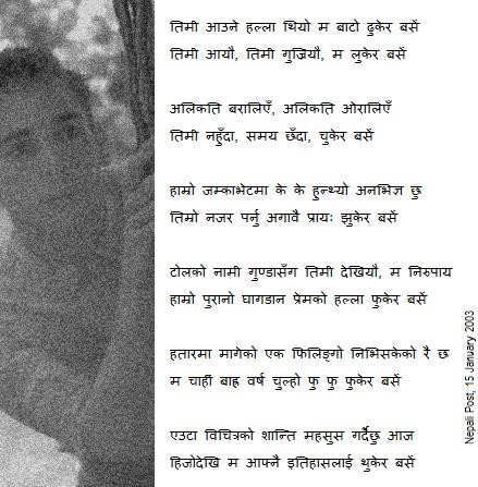 जस्तो माथिको गजल मैले तपाईले पाउनु भएको जस्तै “आम युवाहरु” को पनि कथा हो र मैले थप चाहेको जस्तै “आम-वृद्धहरु” को पनि कथा हो । समय छउञ्जेल लोक (प्रेयसी) लाई बेवास्ता गर्ने लोकतन्त्रवादीहरु (हाम्रा वयोवृद्ध युवा नेताहरु) को पनि कथा थियो त्यो । तर सन्दर्भ चाहिने रहेछ, शब्दले मात्र नपुग्ने रहेछ ।