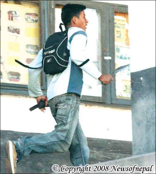 अराजकताः धादिङ हत्याको विरोधमा बिहीबार आ³वान गरिएको उपत्यका बन्दका क्रममा अस्कल क्याम्पसमा दिनभर पटक-पटक बन्द र्समर्थक विद्यार्थी र बन्दको विरोधमा उत्रिएका वाईसीएल कार्यकर्ताबीच झडप भयो । तस्वीरमा झडपकै क्रममा अस्कल क्याम्पसको पहिलो तल्लामा हातमा खुकुरीसहित देखापरेका एक वाईसीएल कार्यकर्ता । तस्वीरः रवि मानन्धर/नेस
