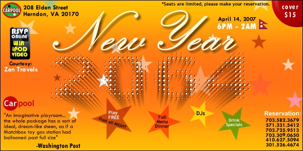 Nepali New Year is just 6 days away and nothing brings people together like the New Year celebration, so don't forget to come and celebrate the Nepalese New Year 2064 party at "CarPool", "One of the happening nightspots in Northern Virginia with an unique Service-Station-as-Americana theme," reviewed by Washington Post and one of the most spectacular venue in Northern Virginia. If you haven't RSVP to the event, do it NOW and double your chances to win a 30GB iPOD Video player. Mark your calendar, Saturday, April 14th, 2007 * Private lounges * Play free pool all night * Special Happy Hour Drink specials * Full Menu Dinner * Live DJs, featuring latest Nepali remixes RSVP online to this event and double your chances to win a iPOD Video. RSVP available at www.dmvpartynow.com Map and Direction 208 Elden Street Herndon, VA 20170 Take a tour of the venue @ www.carpoolweb.com Parking: Please use the parking lot around the back of the building behind Dunkin' Donuts.