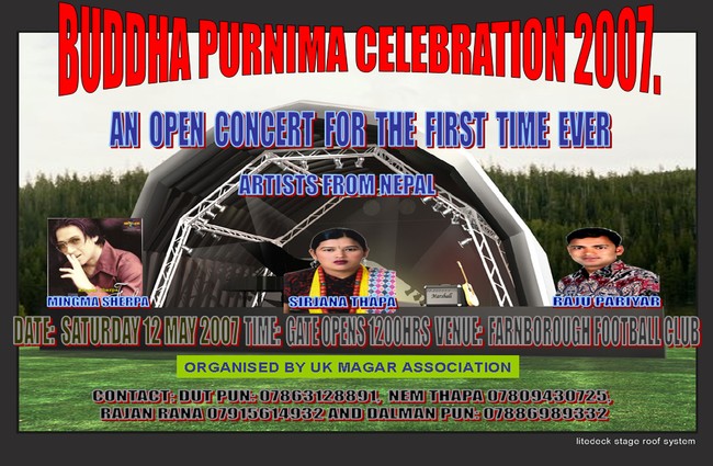 Buddha Purnima Celebration organized my UK Magar Association on 12 May 07 at Farnborouhg and 19 May 07 at Farnborough and Folkestone. very first time Nepalese Programme in Open concert style with provided stalls in the three sides of field to promots and addvert the business of stall owners.