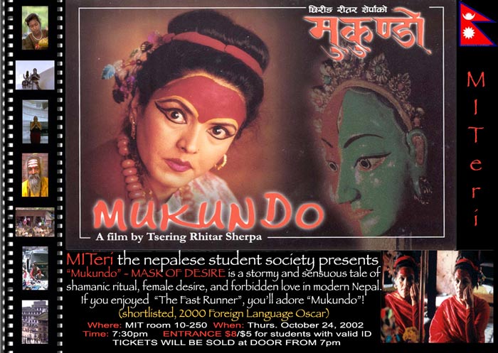 A unique MITeri screening of the acclaimed Nepalese film..... MUKUNDO (MASK OF DESIRE) MUKUNDO (MASK OF DESIRE) is a stormy and sensuous exploration of shamanic ritual, female desire, and forbidden love in modern-day Nepal. If you enjoyed the 2002 hit film, The Fast Runner, you'll love this movie, which was shortlisted for the 2000 Foreign Language Oscar. Where: MIT room 10-250 77 Massachusetts Avenue, Cambridge, MA 02139 When: Thursday, October 24, 2002 Time: 7:30 pm Entrance: $8/$5 for students with valid ID (Tickets sold at door starting 7 p.m.) Film screened with English subtitles!!!!! MUKUNDO (MASK OF DESIRE) Director: Tsering Rhitar Sherpa Story: Kesang Tseten and Tsering Rhitar Sherpa Cast: Mithila Sherma, Gauri Malla, Ratan Subedi, and Rama Thapalia Screened in the following International Film Festivals. **Considered for Best Foreign Language Film (Nepal) at the Academy Awards, 2000 3rd Asian Film Festival, Tokyo, Japan 10th 20th Dec.,1999 Goteberg International Film Festival, Sweden 28th Jan 6th Feb., 2000 Fribourg International Film Festival, Switzerland 12th 19th March, 2000 San Francisco International Film Festival, USA 20th April 4th May, 2000 Fukuoka International Film Festival, Japan 8th 16th September, 2000 Vancouver International Film Festival, Canada 22nd Sept 5th October, 2000 Mumbai International Film Festival, India 20th 29th November, 2000 questions? email: sangita@mit.edu