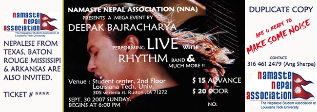 A MEGA EVENT BY DEEPAK BAJRACHARYA AND RHYTHM BAND ORGANISED BY NAMASTE NEPAL ASSOCIATION(NNA) IN LOUISIANA TECH UNIVERSITY. NEPALESE FROM TEXAS, BATON ROUGE, MISSISSIPI, ALABAMA AND ARKANSAS ARE ALSO INVITED. PEOPLE IN GROUP OF 4 OR MORE WILL BE GIVEN $ 5.00 DISOUNT ( OUT OF CITY RESIDENTS ONLY)