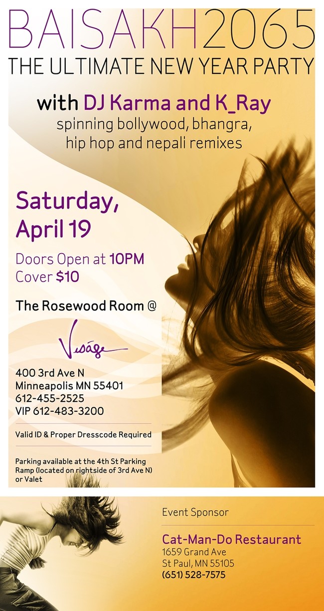 Please come and celebrate the 2065th Nepali New Year with DJ Karma and K_Ray @ Rosewood Room @ Visage on Saturday, April 19th. They will be spinning the latest in bollywood, bhangra, hip hop and Nepali remixes!!