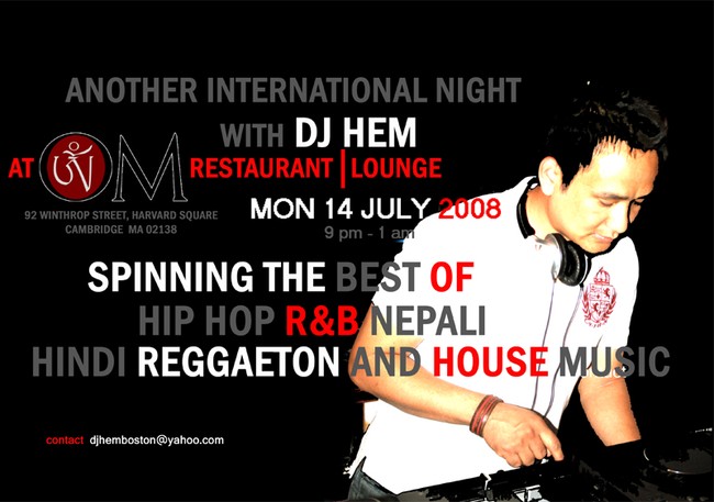 after the rocking night of tue 17th june 2008 with dj hem, now another international Nepali night on mon 14th july 2008. come and rock with dj hem again at om restaurant and lounge Harvard square Boston. chek out the pics at sajha.com of next party.