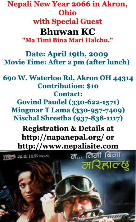 Please join us to celebrate Nepali New Year 2066 in Akron on Sunday April 19, 2009. We are making this a special occasion to welcome about 500 Nepalese from Bhutan who are currently residing in Akron/Cleveland area and eager to meet us. We are making this an all day even with full of outdoor and indoor fun.  Our own superstar Mr Bhuwan KC will be joining us as well with his new movie "Ma Timi Bina Mari Halchu."