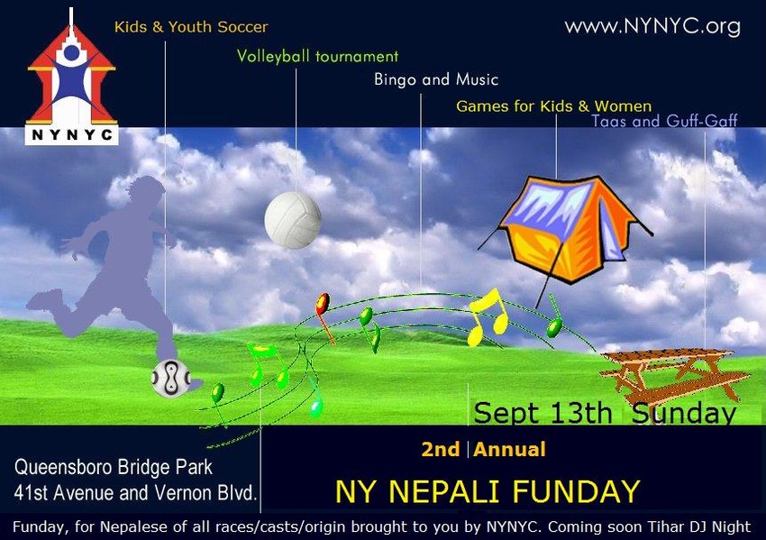 About 500 Nepalese showed up last year for the 1st annual NY Nepali Funday. We expect more crowd this year, September 13th (weekend after the labor day weekend) SUNDAY.