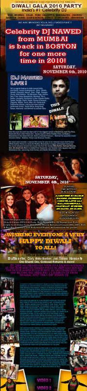 On Nov 6th, on the occasion of Diwali!  We are also celebrating the Badshah of Shahrukh Khan's Birthday with his Favorite DJ.  Celebrity DJ Nawed is coming all the way from Mumbai to rock Boston for One Night Only as part of his Diwali 2010 U.S.A tour!  Deejay \ Producer, Nawed has done the official remixes for such films as: Jail, Don, Golmaal Returns, Om Shanti Om, Bluff master, Salaam Namaste, Billu Barber & more!  We are also celebrating Shaharukh Khans Birthday as well!  This is Shahrukh Khan's favorite DJ people!!  Over 300+ people expected!  One of our Biggest Desi Party of the years!!