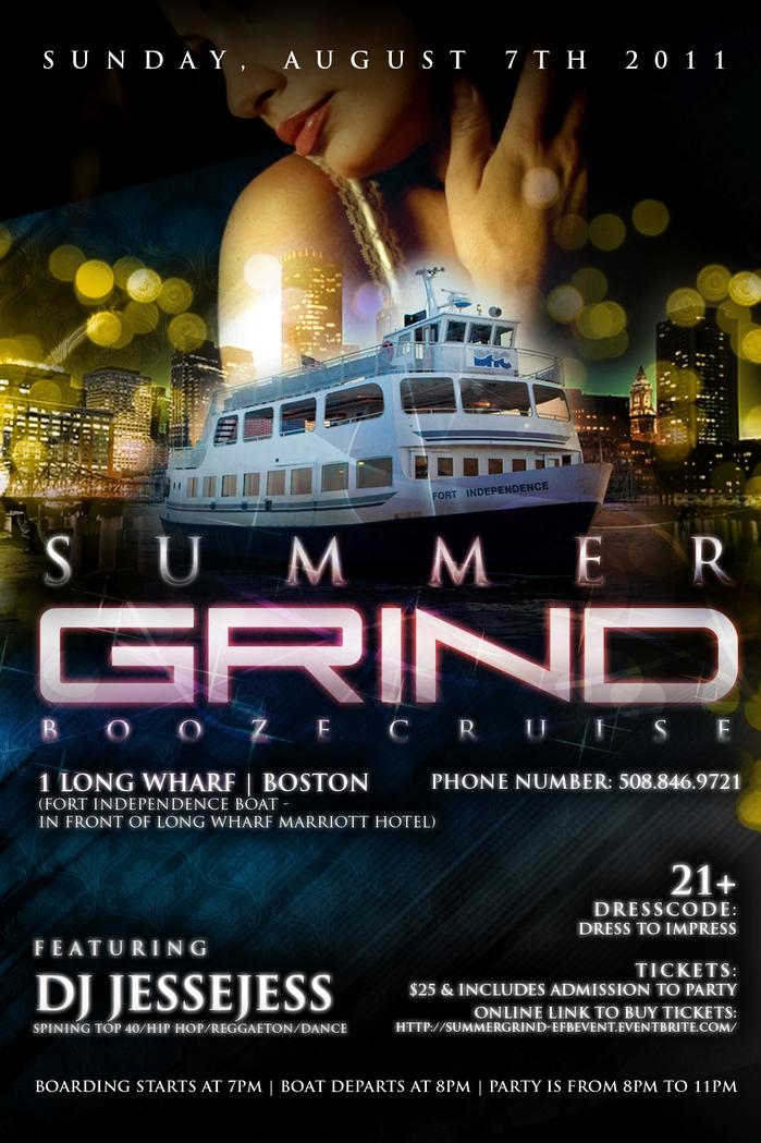 Aug7 at 7pm out at the boston harbor.$25 a person.Booze cruise party...with the hottest DJ from ESTATE DJ Jesse Jess. Hit me up for tickets 6179592218. Or purchase them online at http://summergrind.eventbrite.com/.