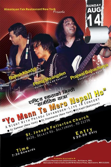 A Night with Phiroj Shyangden(former 1974 AD Vocalist and Guitarist),Rajesh Khadki(Ex-Robin n New revolution) and Prajwal Bajracharya(Yak Band Vocalist n Guitarist) united presenting you an unforgettable night ......August 14th Featuring DJ Sameer(NY),DJ Insominia(NY) and Dj Kapeel(Baltimore)