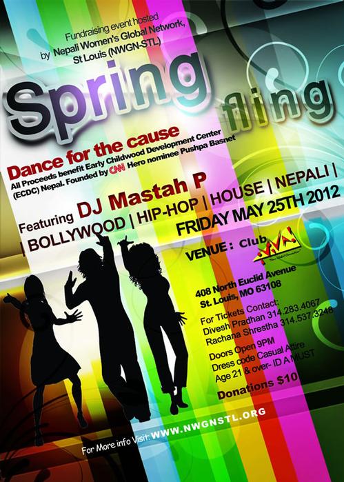 You are invited to the NWGN-STL (Nepali Women’s Global Network) Fundraiser “Spring Fling …Dance for the cause” event at Club Viva on Friday, May 25th 2012 from 9 PM. All proceeds from this event will to the CNN Hero 2012 nominee Pushpa Basnet (Early Childhood Development Center (ECDC)). You can read about her work and watch the video at CNN Hero page. http://www.cnn.com/2012/03/15/world/cnnheroes-basnet-nepal-prisons/index.html