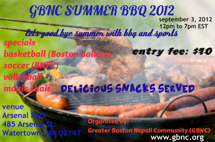 Dear Greater Boston Nepali Community, We are organizing "GBNC summer BBQ event" on Sept 3, 2012 @Arsenal Park, 485 Arsenal St., Watertown, MA02147. Authentic Nepalese snacks with BBQ is served. We will be having friendly Football, Basketball, & Volleyball matches. Entry fee: $10
