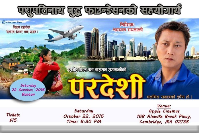 Please join,one of the most popular Nepali Movie “Pardeshi” screening in Boston On Saturday October 22, 2016 by Pashupatinath Buddha Foundation of New England.