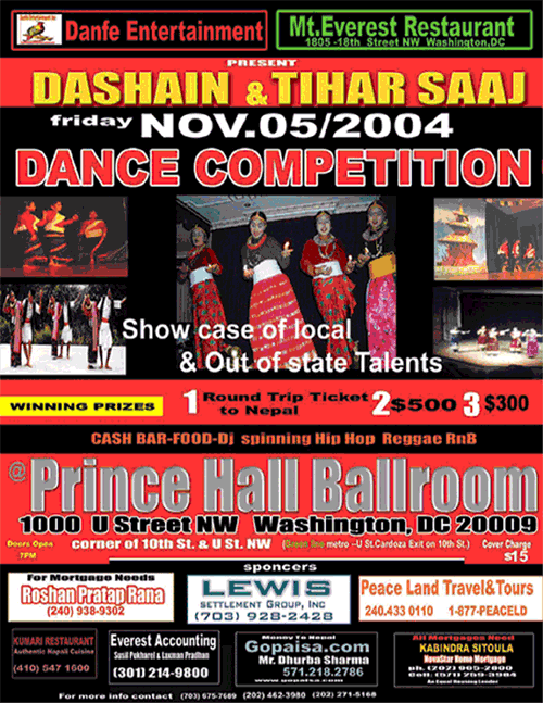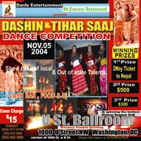 On the auspicious occasion of our biggest festival Dashain and Tihar, we would like to extend our heartiest greetings to one and all. To celebrate the festival together, we would like to invite all of you to the Dashain and Tihar Saaj at Washington DC. Night will be full of entertainment. The local talents as well as the Dancers from out of state will compete to win a grand prize and we could enjoy the best out of these talents. We would have cash bar and food served throughout the night. Prizes for Dance Competition: First prize: Round Trip ticket to Nepal Second prize: $500.00 Third prize: $300.00 $50.00 registration fee for the Dance Competition. Time is limited. So, anyone interested to participate in the Dance Competition please contact Mr. Hemanta Shrestha @ (202) 577-3897 or Mr. Matthew Gyawali @ (202) 271-5168 ASAP. Last but not the least, we would have the DJ spinning latest in HIP HOP, REGGAE, R&B and moreý Rules and Regulation for the Dance Competition: Age group of the participants: 13-25 The participants must dance on Nepali Song or Nepali Music. The participants must be registered on or before Oct 28th, 2004. There will be an audition on Oct 31st, 2004 for all the Participants. Dance could be solo, The first winning prize is Round trip Ticket to Nepal. The second winning prize is $500.00 The Third winning prize is $300.00 Venue: Prince Hall Ballroom 1000 U Street NW, Washington DC 20009 Metro Accessible and parking available. Date: Friday November 05, 2004 Time: 7:00pm - 2:00am Ticket: $15.00 For Direction and Info: (202) 271-5168 (202) 462-7689 (703) 675 7689. Tickets Available @ 1. Mt. Everest Restaurant 1805 18th Street NW Washington DC ph. No. (202) 462-7689 2. Danfe Entertainment @ (202) 271-5168 and (703) 675 7689