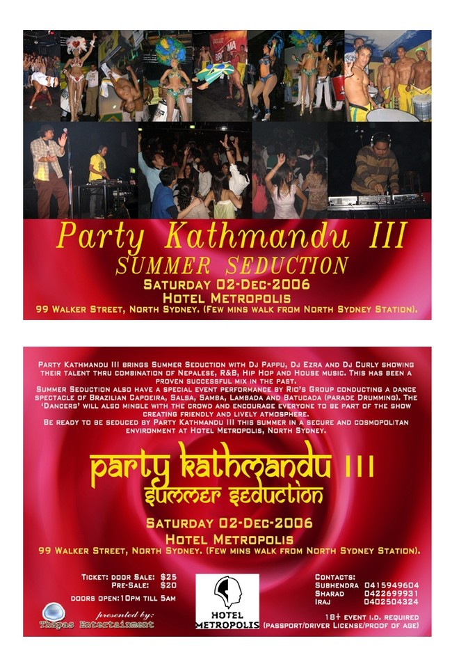 Party Ktm III brings "Summer Seduction" with Dj Papu, Dj Ezra & Dj Curly showing their talent thru combination of Nepalese, RnB, Hip Hop & House music. This has been a proven successful mix in the past. Summer Seduction also has a special event by Rio's group performing a dance of Brazilian capoeira, salsa, samba, lambada & batucada (parade drumming). Be ready to be seduced by Party Ktm II this summer in a secure & cosmopolitan environment at Hotel Metropolis, North Sydney. Ticket: Presold $20 Door Sale:$25 Contacts: Subhendra 0415949604 Sharad: 0422699931 Iraj: 0402504324 ***This is presented by Thapas entertainment, Subhendra Thapa***