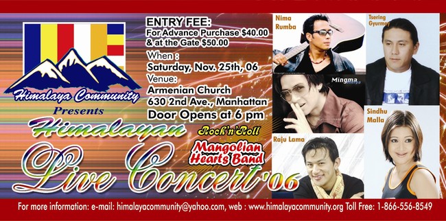 Himalaya Community presents the first "Himalayan Live Concert '06" featuring Mangolian Heart and RAJU LAMA, NIMA RUMBA, MINGMA SHERPA, TSERING GYURMEY, & SINDHU MALLA on November 25, 2006 at 630 2nd Ave, Manhattan, New York. We have limited tickets, so secure your ticket in advance, and save money.
