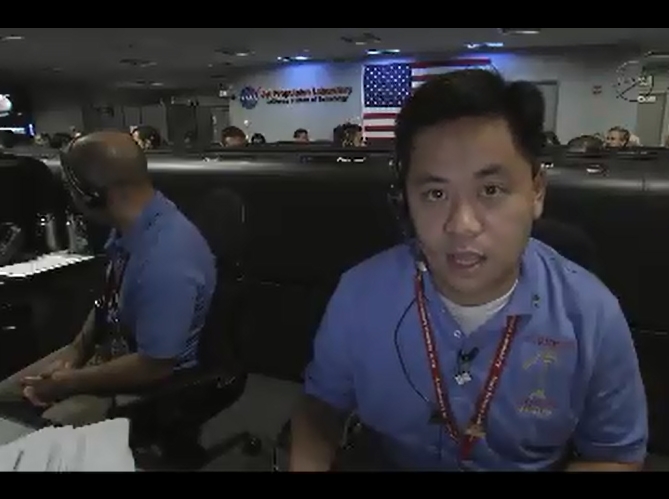 Scientists at Jet Propulsion Laboratory, the one in the front profiling MARs Curiosity Landing LIVE